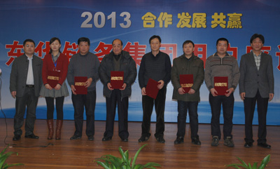 最后,內(nèi)銷公司總經(jīng)理戴迪漢分別宣讀了東華集團和盾牌公司2012年優(yōu)秀經(jīng)銷商名單,宣碧華董事長向優(yōu)秀經(jīng)銷商頒發(fā)了榮譽證書并合影留戀。