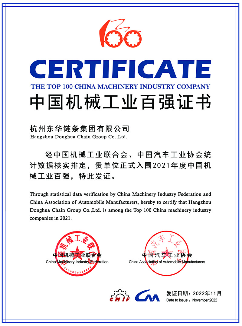 2022年,東華鏈條集團榮登中國機械工業(yè)百強榜第60位,這是東華鏈條集團連續(xù)七年榮登中國機械工業(yè)百強榜,也是中國鏈傳動行業(yè)唯一上榜企業(yè),充分展現出企業(yè)在中國鏈傳動行業(yè)的綜合實力和龍頭地位。